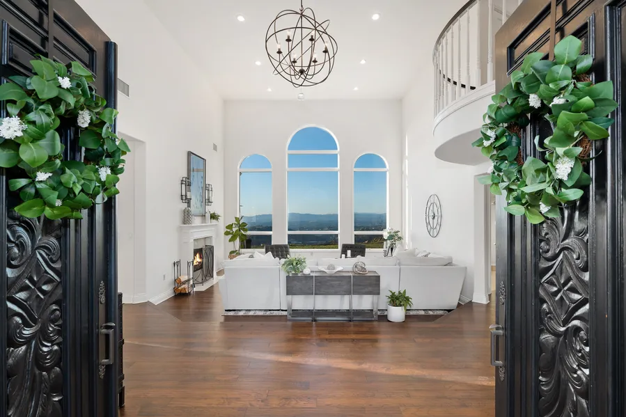 Experience the grandeur of this Mediterranean-style home as you approach along the long & private driveway, framed by groomed boxwoods & set amongst towering trees & manicured landscaping. These picturesque grounds lead you & your guests to the beautiful residence. This remarkable residence combines unique architectural elements with a spectacular setting, enhanced by sweeping vistas of the natural surroundings & mountains. As you enter the home through the double doors, you are greeted with a dramatic & breathtaking entryway. The ample, bright light flowing throughout the entire home creates an elegant & airy atmosphere, bringing a fun & relaxing experience & bright energy to the space. The property offers a large living room anchored by arched windows for dramatic views, mixed-wood flooring throughout, & tall baseboards that create a sense of grandeur & elegance. The soft closing drawers, canned lighting, & upgraded modern light fixtures add a touch of luxury & sophistication. The marble in the downstairs bathroom & the curved Juliette balcony at the top of the staircase are just a few of the many elegant details that set this home apart & give it so much character. Imagine waking up to the sunrise over the mountains & ending your day with beautiful sunsets cascading over the ocean & valleys. The location of this property is truly one of a kind, perched atop a mountain, you will be able to see snow-capped peaks, the ocean, & the mountains from all vantage points in the home & from outside. Some days, you will find yourself above the clouds, with the majestic mountain peaks peering out like islands in the sky. The sunrise & sunsets here are truly breathtaking, with the colors of the sky changing throughout the day; it is a sight you will never tire of. The kitchen is the heart of the home, & this one is truly exceptional. The kitchen is filled with light-infused spaces & features a large island with a prep sink, ample counter space & seating, & top-of-the-line stainless steel Thermador appliances. The 6-burner gas stove is a chef's dream, & the formal dining room is perfect for hosting elegant dinner parties. The dining area is surrounded on one side by a wine display & is flanked by huge glass partitions to take advantage of the breathtaking views. The nook off the kitchen is perfect for intimate gatherings. The kitchen is designed to be functional, yet also stylish & luxurious, making it the perfect space for entertaining & everyday living. The primary suite is a true oasis, designed for luxury & relaxation. The oversized shower, soaker tub, & double vanity sink create a spa-like atmosphere, perfect for relaxing.The makeup vanity area provides ample space for getting ready, while the tiled floors add a touch of elegance to the bathroom. The primary bedroom's large built-in luxury master closet offers ample space for all your clothing, accessories, so you can keep your wardrobe organized & accessible plus a W/D in the closet.The crown jewel of the primary suite is the large private balcony, featuring spectacular views.The open-concept family room boasts built-in bookshelves & shares a double-faced fireplace with the living rooms creating a cozy & inviting atmosphere. With direct access to the backyard, it is masterfully designed for entertaining. The outdoor spaces are indeed an extension of the living areas, making them ideal for indoor-outdoor living. The spacious backyard boasts a turf lawn & a large, paved patio area, making it the ideal spot for hosting guests & enjoying the stunning views.The landscaping is meticulously maintained, adding to the property's overall beauty & serenity. Including a three-car garage with storage cabinets, providing ample space for vehicles & additional storage. The property's unique design & location make it an ideal choice for those who value privacy and luxury living in a natural setting. This property is a rare opportunity to own in the highly sought-after Rimrock Estate gated community!