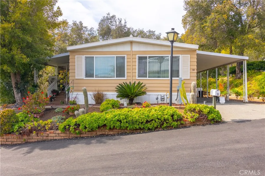 Come live in charming Oak Crest Estates among the protected Oaks, while enjoying the use of established gardens scattered throughout the park. Oak Crest is a 55+ CO-OP LAND OWNED community in a country setting, yet is close to the 15 freeway and Temecula or downtown Fallbrook for shopping. HOA includes Trash, Water and Sewer. Inside you will find Updated Waterproof Flooring, neutral paint throughout, a Floating Wall Entertainment Center for a mounted TV, New Thermostat, New Front and Back doors including A New screen door so you can feel the fresh afternoon breeze! The roof and whole house were serviced 3 years ago. Washer and dryer are included (Refrigerator is Excluded). At entry is a screened in porch which leads into the spacious living area where you will find large picturesque windows with drapery. The kitchen has plenty counter space and solid wood cabinetry with convenient pullou...