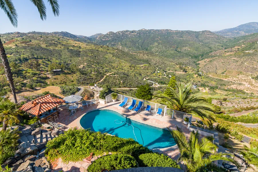 Gorgeous craftsman pool home on mountain top above the clouds w/ 360 panoramic views all the way to the ocean! Paid-in-full new Tesla solar system! Comprised of two adjacent 8+ acre parcels for a total of 16.77 acres (8.6 ac main lot, and 8.17 ac vacant lot w/ separately metered water & electric), this massive estate is tucked into the private, secluded Rainbow community of Fallbrook and is surrounded by gorgeous views of the towering mountains, orchards & scenery. The attached vacant lot has an expansive flat buildable space making it an excellent building site, while the conjoining main lot includes a 4000+ sqft main house and a detached 1250 sqft 1 bed/1 bath guest house/ADU with a separate downstairs living area/office & kitchenette. This one of a kind, stunning upgraded property is an entertainer's dream that feels like vacation with all the premium features & resort-style amenities you could want giving you every excuse to never leave. From the paid-in-full new Tesla solar system w/ a back-up battery & generator, to the zoned central heat/AC and surround sound audio throughout inside & out, no detail has been overlooked in this amazing oasis. Pull into the private gated driveway up to the main house with a tiled front porch entry, adobe-style fireplace and grand double-doors to soaring high vaulted beamed ceilings inside. The home's main level showcases beautiful Brazilian Cherry wood flooring, a full bed/bath, and a stunning gourmet kitchen w/ all the bells & whistles including refrigerated & warmed drawers, stainless steel & custom cabinet-covered appliances, granite counters & backsplash, a spacious center island, double convection oven, automatic faucet, breakfast counter and wraparound wet bar w/ wine cooler & additional cabinetry in the breakfast area that also boasts a two-way fireplace to the formal living room. Downstairs, the separate family room is the life of the party featuring a large lava rock wet bar & fireplace, built-in Category 5 surround sound media center, wine cellar w/ dual-zone Sub-Zero full-length wine fridge, remodeled full bathroom and a finished basement area w/ its own private entry that can be used as an additional bedroom. Sit back, relax & entertain in the home's sprawling backyard that truly feels like a high-end resort vacation that you never want to leave, highlighting a glass-enclosed full bar w/ seating, custom stone waterfall, sparkling blue pool, separate jetted spa, built-in BBQ, open & covered patios/terraces, exterior-access full pool bathroom, and a built-in fire pit– all enjoyed with a jaw-dropping panoramic mountain view backdrop. On home's the top level, the primary suite features an en-suite bathroom w/ dual sinks & a beautiful granite shower, private deck access w/ a luxurious a sauna, and private rooftop patio access for the best views in the house! Every level of the home also boasts wraparound decks w/ upgraded wood panel ceilings offering breathtaking views from every angle and all the way out to the ocean on a clear day, with the guest house also including a spacious attached deck of its own. Throw in the free SD Broadband WiFi, paddleball court, storage building and workshop, the features in this home are endless and impossible to list...this house is a must-see!
