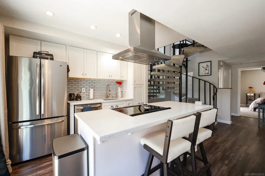 Trendy upgrades throughout this home include quartz countertops, subway tile backsplash, stainless steel appliances and cooktop hood in kitchen. Custom vanities, tiled bath surrounds, vaulted ceilings, smooth textured walls and ceilings, luxury vinyl plank floors in main areas, neutral toned carpet in bedroom and spiral staircase add to the swanky vibe of resort style living. Private patio has private storage and steps away from the complex pool & spa. 1 car detached garage plus assigned parking space. Located in the San Diego Country Estates with many amenities: 18 hole Championship Golf Course, tennis courts, 2 swimming pools, park, playground, sports courts, both western and English horse facilities and 15 miles of hiking and biking trails.