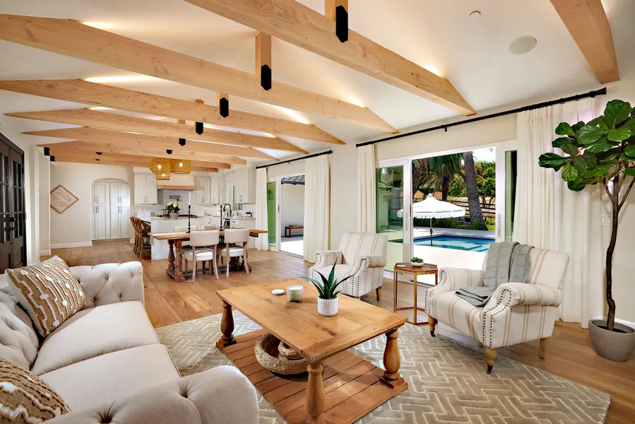Welcome to this absolutely gorgeous ranch-style home in Rancho Santa Fe Covenant. 4 bedrooms, 3 full baths, 2 half baths and an office. Overflowing with natural light and prioritizing comfort, this home is completely brand new finished in 2022. Beautiful White Oak wide-plank hardwood floors. A gourmet kitchen featuring stunning brass finishes, top-tier appliances from Miele and Calcatta quartz countertops with a statement waterfall island. Spectacular architectural wood beams in the kitchen, dining and living room. This open-concept room has three sets of doors that open up to different outdoor areas: An outdoor kitchen including a BBQ, a drink fridge and a large sink; a lounge pool with a unique island surrounded by canary palms; and an outdoor pool bathroom. Adjacent to the great room are two secondary bedrooms, a spacious bathroom and the primary suite with a relaxing spa-like bathroo...