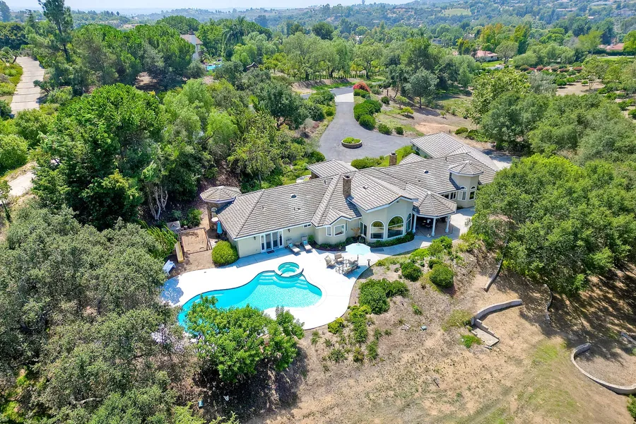 Never leave home! This private custom spacious 3818 sq. ft. single story residence is located in the beautiful park-like setting of the 24-hr guard gated community, Rolling Hills in Fallbrook. This is one of the few designated "equestrian properties" with direct access to the riding trails and facilities. The property spans 2.61 acres of usable space and boasts amazing views to the north of rolling hills and snow-capped mountains in the winter. The home features 4 bedrooms, 1 optional bedroom, 3 bathrooms and a large office. Two bedrooms and 1 bath are at the opposite end of the house with a door for complete privacy. Beautiful oil-brushed oak floors and travertine throughout most of the home. The kitchen has all Thermador appliances, custom Cherry wood cabinets, soft-close dove-tailed drawers and leather granite counters for a beautiful and luxurious feel and look. Master on-suite bath "spa" includes soaking tub and separate walk-in/roll-in shower. Spacious 3 car garage with extra storage area. Lots of usable space for horses, barn, corral, grove or vineyard. Additionally, the home includes desirable amenities such as a gorgeous pool, fully owned solar panels for energy efficiency, EV charging, and a well with a 5,000-gallon storage tank for sustainable water supply. The combination of a luxurious interior, outdoor pool, scenic views, and eco-friendly features make this property an incredible choice for those seeking both comfort and the beauty of nature.