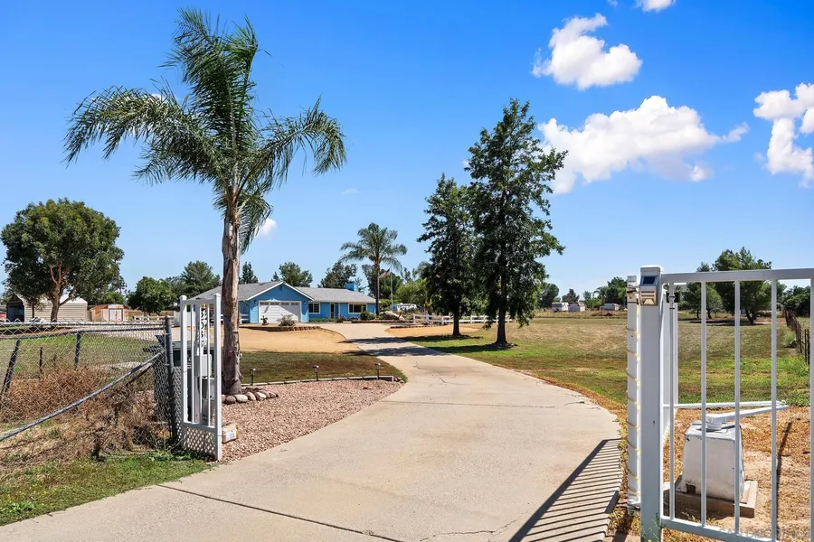 Located on a quiet street & in the center of 2.43 acres is this 3 bedroom, 2 bath home. Vaulted ceilings with wood beam add to the spacious feel as you enter the home and in the living room with a brick fireplace. Dining area is located adjacent to the kitchen with long breakfast bar that is great for informal dining. Primary bedroom suite is spacious, has California Closet organizers in both closets and the en-suite has dual sinks and a spacious shower. Both remaining bedrooms are spacious & have mirrored wardrobe doors. 2 car attached garage as well as an open ended 30x20 shed. Rear patio is covered, great for entertaining and relaxing. Property is fenced with automatic gate entry, flat and usable 2.43 acres. Close to town yet very private neighborhood. Owned Solar to keep costs low!