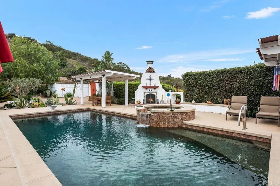Enjoy privacy and nature from this beautiful, gated estate. Perched to capture sweeping vistas with approximately 40 acres of preserved land adjacent, and over 50 fruit trees on site. A resort-like pool, spa, and patio, with fireplace, bar, barbecue, and covered dining are an entertainer's paradise! The flexible floor plan currently has three bedrooms, three baths, two dedicated offices (one of which could easily be 4th BR with ensuite bath), plus a bonus room. Enter from the motor court into a vaulted living room with a custom Kreiss fireplace, Italian porcelain floors, and a stunning wall of windows. The primary bedroom wing offers views, a fireplace, a spa bathroom with a soaking tub, shower, dual vanities, a walk-in closet, and a private walled garden sanctuary. A chef's kitchen offers a Viking range, Sub-Zero refrigerator, dual ovens, new dishwasher and microwave, pantry, and eat-in dining. The family room has a gas fireplace and French doors to both the pool area and a covered porch that runs the length of the home. A separate dining room, office, and bath complete the main wing. Another wing hosts two bedrooms, a bath, an office/mud room, and a large bonus room with built-ins and a wet bar. With multiple doors to the pool area, this home invites gathering and fun! This immaculately maintained home is single level but does have some interior steps. Upgrades include newer windows throughout, solar with two Tesla battery walls, electric car charger, two newer A/C units, security system, replaced pool pump, newer water heater, and solar assisted hot water, updated skylights, French drain and gutters, rebuilt gazebos, and carport. Flat, cleared land below is ideal for a barn, equestrian arena, vineyard, grove, or garden. Located within the Rancho Santa Fe and San Dieguito High School Districts! Elfin Forest has over 2,000 acres of preserved land, miles of equestrian trails, and low-density housing restrictions that ensure tranquility remains a valued commodity.