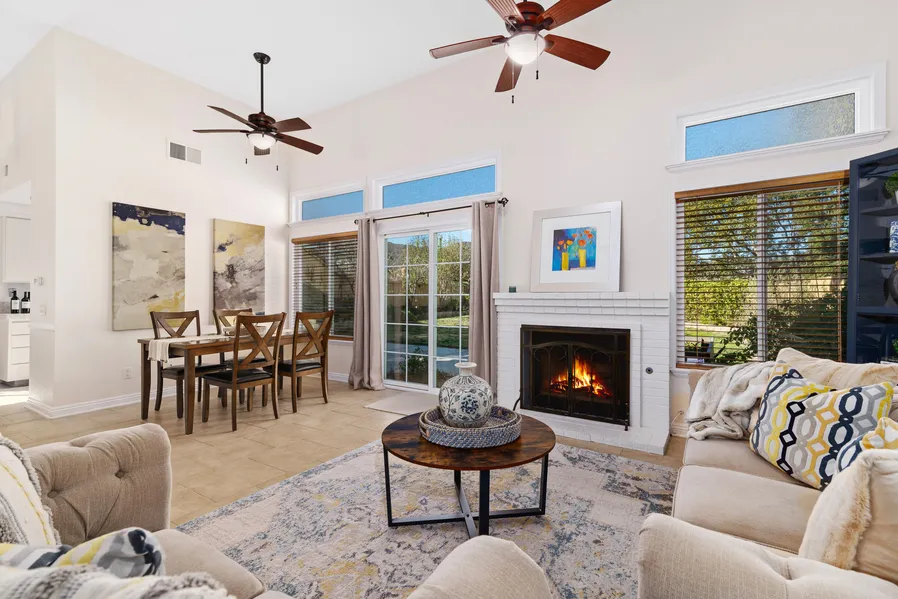Welcome to Westwood a one-of-a-kind community in Rancho Bernardo offering rolling hills and unsurpassable access to all. This duplex styled three bedroom home is sited on a tranquil cul-de-sac and boasts an expansive backyard that is a rare find. Upon entry one is greeted with vaulted ceilings and an abundance of natural light. The great room, adorned with a fireplace and a dining area, seamlessly connects to the outdoors through a sliding glass door, providing a perfect blend of indoor and outdoor living. The charming kitchen, complete with stainless steel appliances and a cozy nook, is ideal for day- to-day culinary experiences. The spacious primary suite is a private oasis, offering panoramic views of the surrounding hills . The additional secondary bedroom, along with a full bath is just down the hallway. A versatile office/den, strategically located at the entry level, could effortlessly transform into a third bedroom with the addition of a closet. A spacious two car garage offers extra storage, is host to the laundy area and offers an electric vehicle charger. However, what truly sets Westwood apart is the exclusive Westwood community center, a haven reserved for residents only. One can indulge in the amenities that cater to every lifestyle, including a swimming pool, tennis courts, pickleball courts, indoor gymnasium and basketball court, athletic field and more.