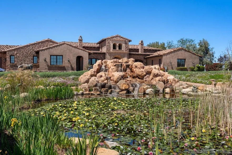 Nestled in the gated Highland Hills community, this custom-designed estate by Scott Grunst sits on over 8 acres, offering the ultimate in energy-efficient, green living. With double wall construction, a 60kW solar system valued at over $300k, and a private well, this home is fully self-sufficient. Over $500k was invested in custom woodwork and soaring 22-foot ceilings. Two executive offices with fireplaces and panoramic views of the pond and mountains provide the perfect remote work environment. Luxury finishes include Hearst Castle-inspired chandeliers, Venetian plaster, and precast stone fireplaces. The chef's kitchen features travertine countertops, Miele and Wolfe appliances, a copper farmhouse sink, custom knotty alder cabinetry, a large island, and a butler s pantry with a Miele coffee system and steam oven. Entertainment options include a private 8-seat theater, a bar with a wine room, and an exercise studio. The outdoor spaces are equally impressive, with landscaped grounds, multiple patios, a 130,000-gallon pond with a waterfall, and a 1,508 sq. ft. covered veranda with a fireplace, sunshades, heaters, outdoor kitchen, and dual TVs overlooking the infinity pool. This smart home includes automated shades, Stealth acoustic speakers, a hidden safe room, advanced security systems, room-specific temperature controls, and full automation. The estate also features an income-generating avocado orchard, fruit trees, a 3,000 sq. ft. vegetable garden, and more. Every detail has been meticulously crafted for luxury living.