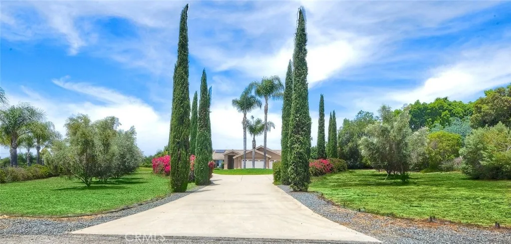 This Charming single-level home is situated on nearly 3 acres of land and is nestled in the scenic hills of Fallbrook. As you drive along the quiet street, the home comes into view with its expansive circular driveway, lined with tall Cypress trees, creating an atmosphere of stately elegance. Upon entering, you're welcomed by a wall of large windows that frame breathtaking views of mountains, trees, and the sparkling pool. The interior is open and bright with dramatic high ceilings, many windows, and a fresh coat of paint. The spacious kitchen, with stunning granite countertops and stainless steel appliances, includes a sizable center island that makes cooking enjoyable while taking in beautiful views. It seamlessly transitions into the generously sized family room, highlighted by soaring ceilings and a stacked stone fireplace, making it a perfect spot for socializing. The scenic backyard, complete with a spacious patio, refreshing pool, relaxing spa, and multiple seating areas, is a pleasure to entertain in. Extending beyond the gate, you will find additional land with many olive trees. The primary bedroom provides a secluded retreat featuring sliders that access the backyard with views. The primary bath includes double sinks, a soothing jacuzzi tub, a large shower with dual heads, and a walk-in closet. Additionally, there are three good-sized bedrooms and two full bathrooms situated on the other wing of the house. Other notable features include engineered hardwood floors, new carpeting in the bedrooms, a Tesla charger, and new sliding glass doors. Conveniently located close to town, shopping, the 15 and 76 freeways, the Santa Margarita River Trail Preserve, hiking and horse trails, and more!