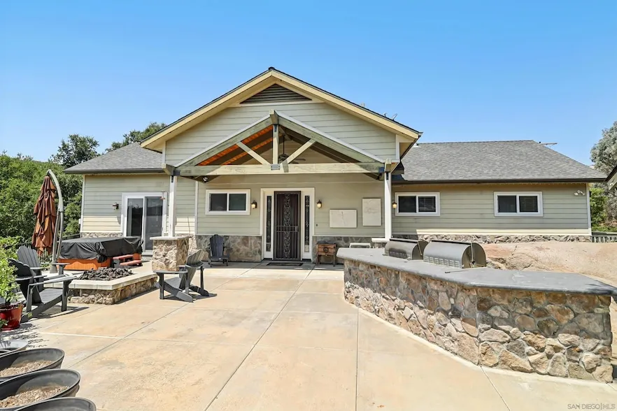 Welcome to Seven Meadows in beautiful Ramona. Surround yourself in the beauty of nature with majestic oak trees, a seasonal stream, and serene mountain views. As you enter this retreat-like residence, you are greeted by 2 vineyards, a fruit orchard and a bridge over the stream, leading up to the two residences. The main home is 3BR/2BA and lives like a single level luxury cabin. Vaulted beamed ceilings, wood floors, stone accents and a floor to ceiling stone fireplace. The kitchen blends with knotty pine cabinetry, stainless steel appliances and two breakfast bars with seating for 8, plus a walk-in pantry. The primary bedroom suite is located on the opposite site and features a sliding glass door to the patio with built in BBQ, pizza oven, firepit and portable spa. There are two walk in closets and a luxurious bathroom. The other wing of the home offers two bedrooms, each with access to ...
