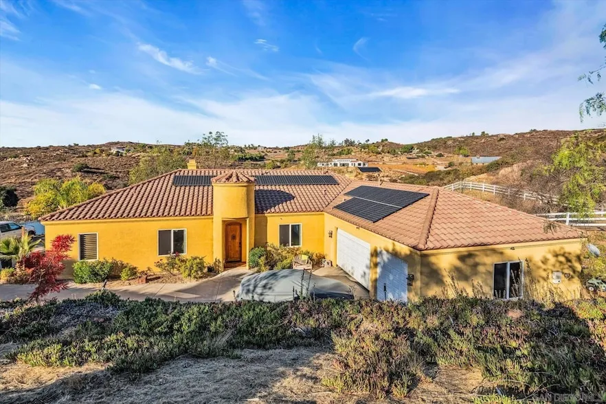 Stunning West End Ramona Retreat with Panoramic Views, Paid-Solar and Room to Grow! Serene sunrises and breathtaking sunsets await you at this exceptional 3.29-acre estate in Ramona s highly desirable West End, just minutes from the region s wine country. Built in 2005, this meticulously maintained 3,000 sq ft home offers a rare combination of privacy, elegance, and versatility with no HOA, fully paid solar with Tesla battery backup, fast internet avail. and panoramic views of the surrounding hills and tranquil pond. Step inside to discover soaring, 10-foot-high ceilings, custom wood shutters, new Milgard windows, dual zone climate control, and 8-foot doors. Abundant natural light creates a welcoming, airy atmosphere. The gourmet kitchen is a chef s dream, featuring granite countertops, built-in ovens, a large center island, and a drop-in gas range. Enjoy peaceful morning views from the breakfast nook and cozy evenings by the fire in the open concept living area. The private master suite is a true sanctuary with its own fireplace, walk-in closet, luxurious en-suite bathroom with dual stone vessel sinks, soaking tub, walk-in shower, and private outdoor entrance with serene pond views. On the opposite wing of the home, two generously sized bedrooms share a full bathroom, along with a conveniently located powder room. This thoughtfully designed home also offers multiple flexible living spaces, including a formal dining room, a spacious den or library with a third fireplace and stunning views, and an additional bonus room ideal for a home office, gym, or playroom.