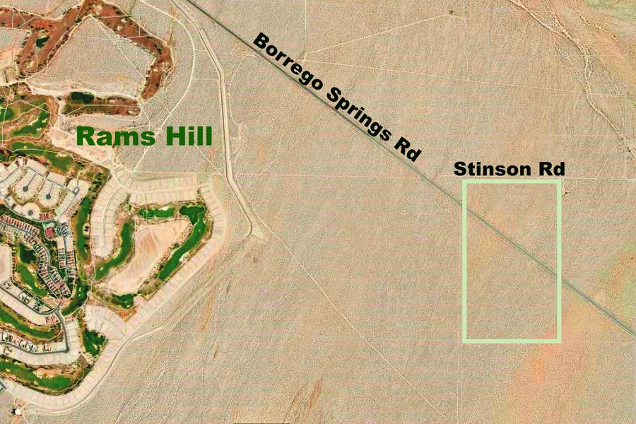Driving Directions: From Rams Hill Country Club in Borrego Springs, drive approximately one block southeast on Borrego Springs Rd. The parcel is on the left and the right of Borrego Springs Rd. Stinson Rd runs along the northern border. Take the aerial map.