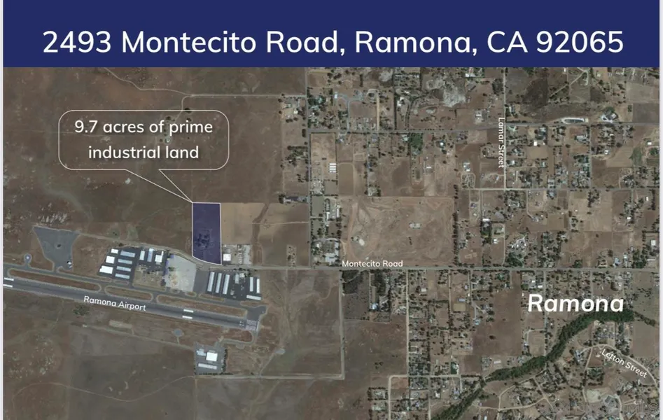 Nestled comfortably in more than 8,000 acres of the Santa Maria Valley in Ramona, California, and just a little more than thirty minutes from downtown San Diego, is this prime 9.7 acre parcel with M54 zoning directly across from the Ramona airport. Many uses from commercial to heavy industrial. Property has approx. 1200 sf residence that could be used for office. Value in land and zoning. Topography is flat, paved public road to site. 2 wells (one capped) and water meter installed, septic system installed.