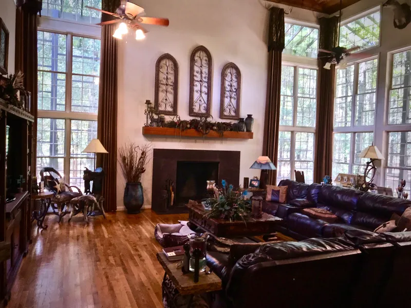 MAIN HOUSE: The main house on Nebletts Creek Ranch is a hidden treasure. Nestled in the native pines and hardwoods this private estate home has left nothing to the imagination. The LIVING ROOM has a magnificent fireplace framed by floor to ceiling windows. The beamed and vaulted wooden ceilings and the oak hardwood flooring provide the home with a rustic warmth. A formal dining room has an alcove for a buffet and an entire wall of floor to ceiling builtin custom cabinets. Granite counter tops with a double stainless sink looking out to the garden is complimented by a single sink on the opposite side. Commercial stainless steel appliances include...