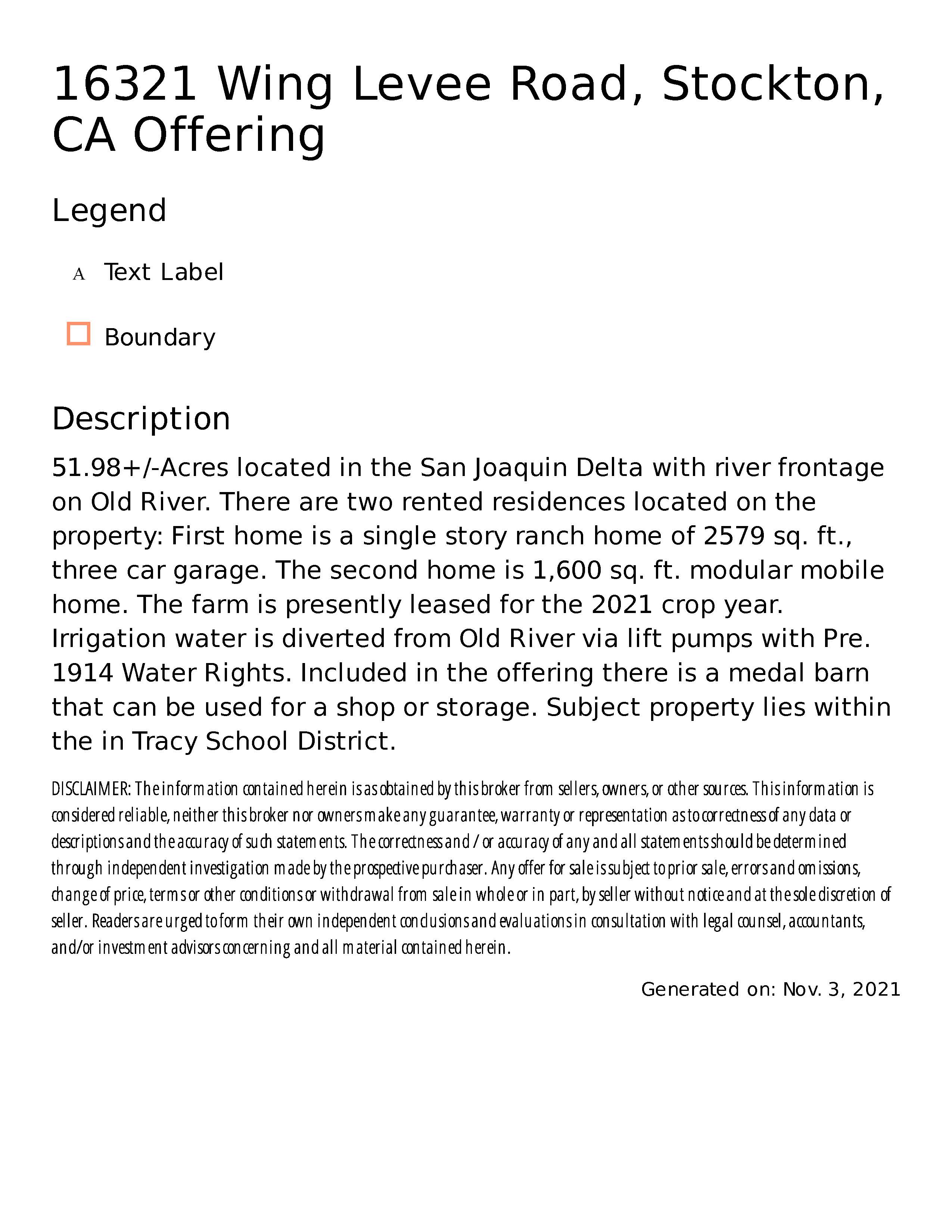 Research Parcel InformationFrom Stockton: Hwy 4 West, turn left onto S. Roberts Road to Undine Road, turn right onto Howard Road, turn left onto Undine Road, turn right onto Wing Levee Road 0.1 tenth mile to 16321 S. Wing Levee Road.