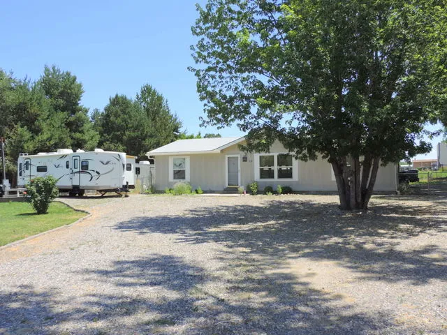 Nice well kept country property that sits on half an acre with ditch irrigation(per seller). Three bedrooms and 2 full bathrooms with an open floor plan and refrigerated air conditioning. Landscaping in the front and back of the home with a large covered patio to view the backyard. Lots of parking and two sheds that stay with the property. RV access too.
