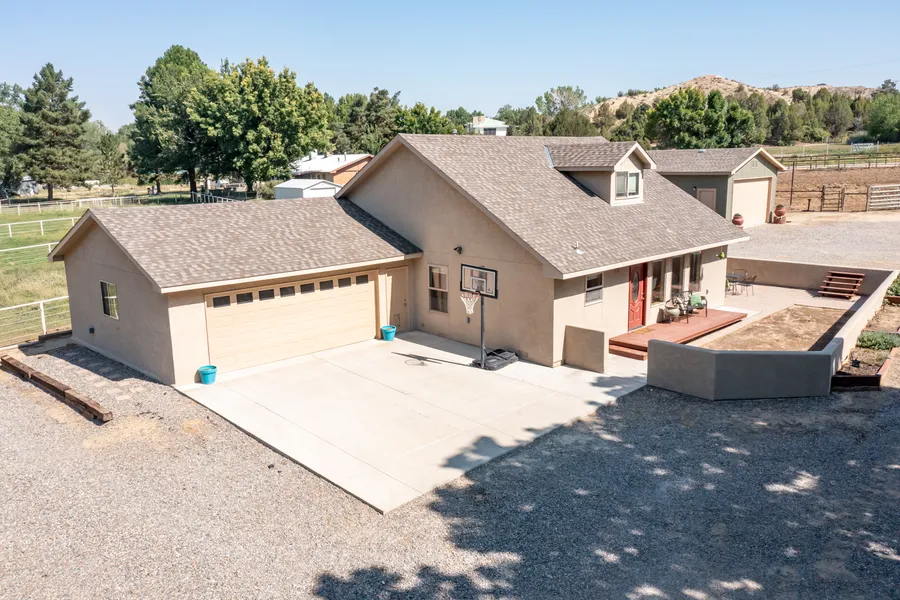 Beautiful country home, 3BR, 2BA with an attached 2 Car Garage and a detached oversized 1 Car Garage/Shop on .808 Acre. This kitchen is open to the dining area, with a breakfast bar, gas range, microwave, dishwasher included. The master suite includes a walk-in closet, and master bathroom. The Living Room is open to the Dining area and includes an entertainment bar. Upstairs, there is a large Family Room or Craft Room. Outside, the west area of the property is landscaped like a park with luscious green grass, lots of berry bushes and a garden area. On the east side of the property, there is a corral for horses. The property has irrigation from the Farmers Ditch per the seller. There is RV parking with 2 RV Electrical hook ups.