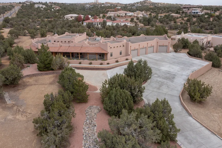 This unbelievable custom home features a Southwestern flair, all on a single level. With room to roam, it has 4730 Sq Ft, 2 master suites, 4 bathrooms, 3 gas fireplaces and an oversized 2597 Sq Ft four car garage. Surrounded by courtyards with huge patios, covered porches and an in-ground pool, perfect for entertaining. The home has a sunken living room upon entrance, with a beautiful Kiva Gas Fireplace that reaches up to the vigas and latillas on the ceiling. Passing the Living Room, you enter the Family Room/Kitchen with the same ceilings and a wet bar. The Kitchen has granite countertops, Wolf brand appliances, subzero refrigerator/freezer, 6 burner gas stove, convection oven and microwave. The island is perfect for preparing meals that can be served on the breakfast bar as well as in the Formal Dining Room. There is a Butler's Pantry between the Formal Dining Room and the Kitchen. Down the curved ceiling hallway you will find the Media Room with surround sound. Across the hall are two Bedrooms connected by a Jack n Jill Bathroom. The Laundry Room is to the right and includes cabinets and a washer and dryer. At the end of the hallway is the 2nd Master Bedroom. It has a Kiva Gas Fireplace, vigas and latillas and beautiful Master Bathroom. On the other side of the home is an Office/Bedroom 5 with an attached Bathroom. Plus the Master Bedroom, including a Kiva Gas Fireplace, vigas and latillas on the ceiling, a huge walk-in closet, Master Bathroom with shower and tub and a bonus room. It could be used for an exercise room, sewing/craft room or whatever you desire. Come take a look at all the amenities in this wonderful home!