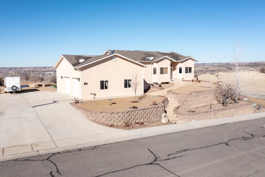 Spectacular views from this one-of-a-kind custom-built home in the Kokopelli Subdivision. This home is a very spacious home with a walk-out basement, 6 bedrooms 4 (bedrooms have walk-in closets), 4 bathrooms, plus 2 living areas. The main-level has it all ''on'' one floor; a large and bright master bedroom that is comfortable and inviting with a spa-like bathroom to go with it. The 2nd main level bedroom is large with a walk-in closet and it's own private bathroom. This room can also be used as an office/study or a quiet guest bedroom. The formal dining room has gorgeous views of the valley and the Colorado Mountains plus a chandelier ceiling fan and pot shelves. The kitchen is just off from the formal dining room, and is bright and inviting with custom hickory cabinets, beautiful granite counter tops, a breakfast bar, a walk-in pantry and kitchen appliances are included. The kitchen nook has beautiful views as well, plus a sitting bench. The living room is large and has a wood burning stove, ceiling fan and pot shelves. Just outside the living room is a deck that can be used for entertaining with an outdoor kitchen setup with water, drain and a gas hookup. There is access from the master bedroom to the deck that would accommodate a hot tub and the power setup is available. Refrigerated air and two furnaces (forced air and radiant heat); plus, solar panels help keep this wonderful home comfortable with heat and cooling. The walk-out basement has a den that is spacious with an area, that has plumbing ready for a wet bar setup and 2 ceiling fans. Another large master bedroom with an adjoining bathroom and access to the covered patio is one of the 4 bedrooms located downstairs. The upstairs laundry room has cabinets, a sink, plus a washer and dryer that will stay. The double car garage is oversized and has an electric vehicle plug for an electric car! There is a central vacuum system throughout the home. A dumb waiter goes to the lower level for convenience. The low maintenance yards feature beautiful xeriscaping from the front yard to the backyard. Under the deck is another patio area for entertaining and to enjoy the gorgeous views! One can set outside by the fire pit to enjoy life with family and friends! Taxes may change after closing. Buyers to verify square footage before closing. All appliances are sold as-is; whereas. Taxes may change upon sale.