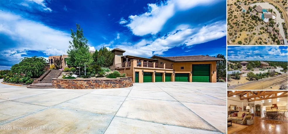 ''Hacienda de las Vistas'' is a completely custom, one-of-a-kind, luxury experience. This unique mansion overlooks Northern Farmington, NM & includes views of the City, the Valley & Rivers, & the mountains to the North. The main home has 8 attached heated garages, one being an RV garage. This property is massive! Over 5,690sf of living space in 2 residences (not including the garage loft area), & over 5,385sf of attached heated garage space! This home even includes a full-size elevator to get from the garage to the main house! No expense was spared in the construction of this Hacienda. Kitchen boasts extreme vaulted ceilings, custom duo-tone cabinets, professional stainless appliances, double dishwasher, leather textured granite, Viking Professional 6 burner stove w/ griddle & dual oven, & separate fridge & freezer, in counter blender & ice maker, professional vent hood, over stove faucet, & pantry. The remainder of the home has the same level of excellence. Main house has 2 bedrooms w/ en-suite restrooms & oversized closets. Dining room, den, office, laundry, 4 pantries, & game room. Covered front patio w/ lighting, fans, & views for 100's of miles. Access from patio to garage loft (game room) w/ 1/2 bath. Attached garage 1 is 3-car w/ workbench, sink, mop sink, storage room, & understairs storage. Attached garage 2 has loft, vaulted tongue-&-groove ceilings, room for 4 cars & 1 RV, a 4-post lift, sink w/ mop sink, 1/2 bath downstairs, & upstairs, storage room, & a full-sized elevator. Garage 3 is a detached earthen garage for the guest house. Guest house has a full kitchen, living room w/ stove, balcony, loft bedroom, & bathroom w/ a 6-jet shower. Too many features to list, but here are a few: courtyard w/ firepit, waterfall, & outdoor fireplace. Playground for 20-30 kids. Hiking trail w/ rest stops & a deck on top w/ labeled 360 views. Driveway large enough for 10 tour busses. Built-in speakers. Custom landscaping. Garden area.