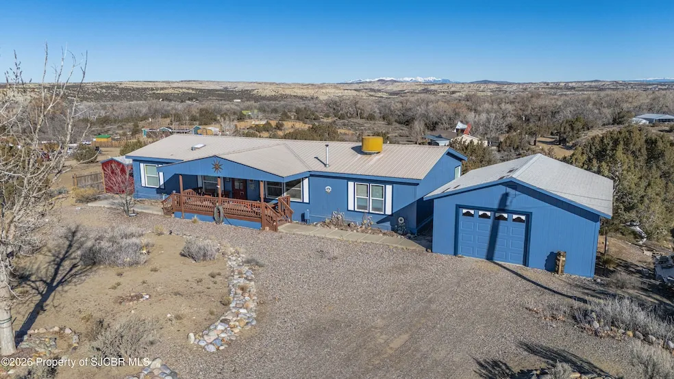 Welcome to wide-open living in the Land of Enchantment. Set on 1.6 acres of New Mexico countryside, this well-maintained 3-bedroom, 2-bath Manufactured Home offers stunning La Plata Mountain views from the rear of the home and the covered back deck -- a perfect place to unwind and take in the scenery. Inside, the split floor plan provides privacy and flexibility with two spacious living areas, ideal for gathering or quiet retreat. Recent updates include new laminate flooring in main living spaces, updated tile in the kitchen and bathrooms, and new stainless-steel appliances, all complemented by a large pantry and abundant natural light. The open dining and kitchen area flows effortlessly, making entertaining easy and inviting. The primary suite is generously sized with a walk-in closet featuring built-ins and a roomy bathroom with dual sinks- a true place to comfortably retreat at the end of your day. Outside, the property truly shines. Enjoy a covered deck, backyard firepit area, and expansive land with room for gardening, animals, workshops, or future possibilities. County living means no zoning restrictions, offering rare freedom to use the land as you choose. Additional features include a metal pro-panel roof, tankless hot water heater, energy-efficient double-pane windows, newer custom blinds, and a recently painted exterior. The oversized insulated single-car garage on a slab includes built-in cabinets, workspace, and a garage door opener. Peaceful and private yet conveniently located with an easy commute to Durango and Colorado this home places you near Navajo Lake, local rivers, hiking, biking trails, fishing, and endless Four Corners recreation. A place where space, scenery, and freedom come together -- welcome home.