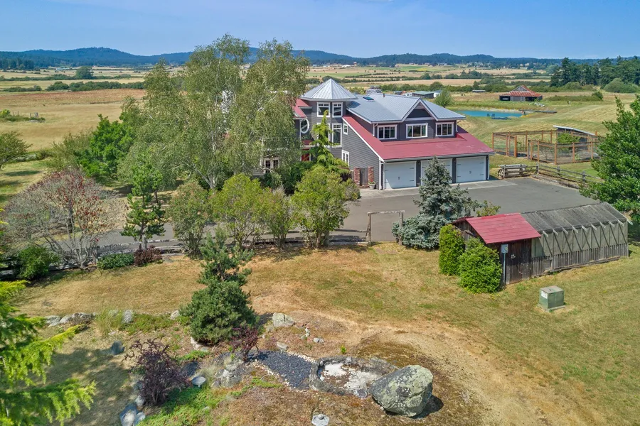 Come live your island dream in this bright and welcoming home on ten picturesque acres. The gourmet kitchen with granite counter tops, double ovens, separate prep sink, and wine cooler is a chef's delight. The sunken living room charms with an eye-catching stone fireplace and cozy bay window seats. Enjoy the pastoral views from the covered back porch and breath in the sea breeze from nearby Falsebay, or entertain your guests in the private front courtyard. Enjoy features like built-in custom bookcases, window benches, two walk-in pantries, a spacious laundry room, powder room, wine cellar and a dedicated office with French doors to the courtyard. The second level has a generous Master suite with separate seating area, fireplace and private balcony. The en suite has a walk in marble shower, a soaking tub and double vanities. Don’t forget the his and hers walk in closets. Down the hall you will find two more generous bedrooms with a flex space in between, a large full bathroom, a family room and a bonus room perfect for guests, movie watching, or an in-home gym. To top off the inside there is a playful full height loft in the turret. Outside you will find a greenhouse and fully fenced garden to grow your bounty. A swimming pond with brand-new dock, beach and a fire pit for those warm summer days. A separate gated entrance leads to the open back five acres, complete with historic barn with hayloft, ready for your horses or livestock and brimming with opportunities. This location offers privacy yet is only a five minute drive away from downtown Friday Harbor and all its amenities