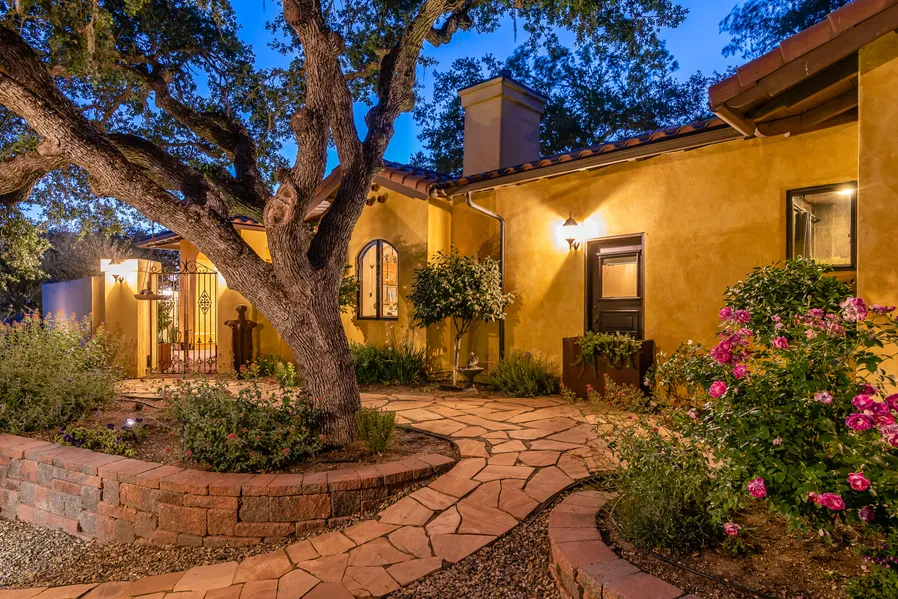Stunning Spanish Hacienda style estate located on 5 acres in Templeton. Complete with two custom homes, large garage shop, olive and oak trees and sophisticated design elements throughout. The main house offers an effortless floorplan of 3,055 sq. ft. with stained and polished concrete floors, impressive vaulted ceilings and French doors that access the outdoor living space. The front entry is welcomed by a custom Alder front door onto the living room, dining room and kitchen featuring fireplaces, chandeliers and custom windows. The kitchen stuns with a generous Limestone center island with prep sink, walk-in pantry and stainless-steel appliances. The meticulous craftsmanship continues in the master suite with a window seat, gas fireplace, large walk-in closet, soaking tub, custom walk-in shower, travertine tile and private access to the patio. The highly updated 1,212 sq. ft. guest house features 2 bedrooms, 2 baths, large charming front deck and private driveway. The property embraces indoor-outdoor living with hilltop views and oak tree coverage surrounding the enclosed courtyard and backyard spaces.
