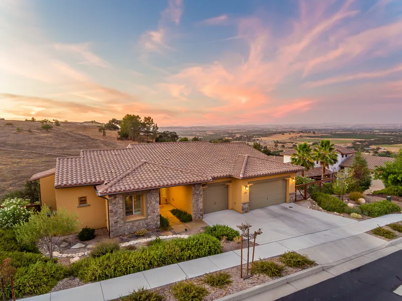 Polished Paso Robles home with views of the serene rolling hills and sunsets from the main living space and large private balcony. This 2,996 sq. ft., two-story home offers 4 bedrooms, 3 bathrooms and spacious open concept kitchen, dining room and living room. Featuring gorgeous hardwood floors, upgraded Thermador induction cooktop and double oven, custom shelving in pantry and custom smart devices. The main floor includes kitchen, master suite, guest bedroom, laundry and garage while the lower level includes two additional bedrooms and 1,200 bottle wine room with its own AC unit. Many custom features throughout including Medeco deadbolts, smart devices for thermostat, security and irrigation systems, polished concrete garage floor and shutters on windows for privacy. Entertain and enjoy the peaceful views from the upper balcony and private lower patio with landscaped walkways leading to...