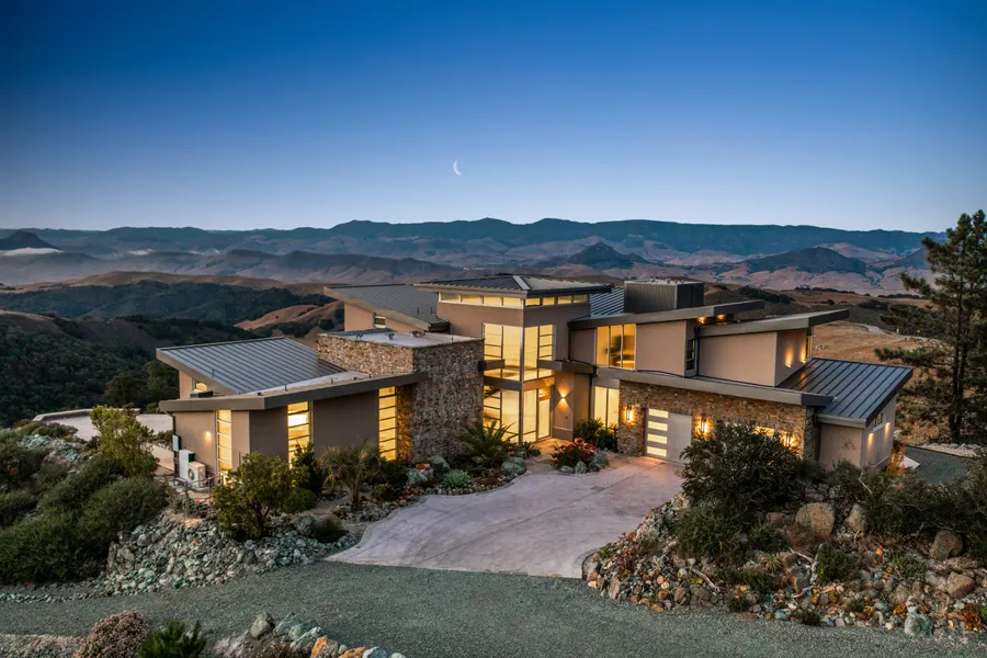 Welcome to this one-of-a-kind Frank Loyd Wright inspired, architectural masterpiece. A spectacular offering of a forward thinking custom design from the moment you enter through the private gates. Dramatic clean lines allowing as formal or casual experience as you like while drawing you in through the European designed Dayoris interior doors throughout and incorporating privacy with the fluted reeded textured glass. The foyer is magnificent, featuring a steel fabricated monorail staircase patina stained including dramatic stairway landing lights. The main living space showcases oversized storefront windows capturing the breathtaking vast views. Also used as an in home movie theater providing Sonos surround sound throughout and the ever so convenient and disappearing TV Inca floor lift emerging from the porcelain white marble like tiles. Adjacent is the impressive custom granite table with a top mounted Gaggenau wok,a true conversational piece while preparing delicious meals all the while as you soak in the infinite ocean and valley views by day and stunning sunset sky views by night. The chefs kitchen displays high end graphite Dacor appliances including 48" professional style range, convection wall oven,refrigerator and freezer tower,temperature zoned wine cooler,top of the line dishwasher as well as a pot filler over the main stove. as you soak in the infinite ocean and valley views by day and stunning sunset sky views by night. The primary bedroom boasts a modern floating ghost door with fluted reeded glass panels, a chic built-in bed frame with back cabinet storage, 44" Inca TV lift installed at the foot of the bed, motorized zoned electric Hunter Douglas window shades with anodized aluminum valances for privacy. Within the primary bath all cabinets are floating custom color coordinated in white and silver/bronze panels with another fabulous touch of elegance by adding electric pivot mirrors. All tile is professionally coordinated and designed in house by a master craftsman alongside Schluter zone heated floors accompanied by motion detector lighting throughout the main floor bathrooms. A Kohler soaking tub with heated walls the coveted ocean and Morro Bay Rock scenery. The oversized primary closet dones a his and hers section of custom hanging. Including an island of granite for seating and built-in drawers. A custom LG steam cleaner keeps clothing items refreshed and pressed. A separate area within the closet has a designated space for a stackable W/D including cabinets and countertop for folding. The guest bedroom resides on the second level featuring a dedicated privacy deck overlooking the backyard fireplace and awe inspiring views. All the aforementioned custom cabinet and closet upgrades pertain to this private retreat space. Returning to the main level is the third bedroom with a well designed Canadian built wall bed used for extra storage and fold out table. Perfect for an office and also used as a third bedroom. Garage is pristine, floors are coated with a versatile acrylic plus double coated sealer. Garage is wired in for a big screen TV including refrigerator and freezer along with two electric car charging stations for fast charging. The residence lends itself to hosting friends and family with the attached guest suite accessible from an impressive exterior steel fabricated staircase, complete with high end appliances, granite countertops, expansive built-in closet and bathroom and same level of beautiful design finishes as the main house. Exterior amenities include outdoor shower, alarm system, zoned sprinkler system on timer, Tesla powerwall battery backup, solar panels Kohler generator, gas firepit on timer for safety, water treatment equipment separate storage room,10,000 gallon storage tank plus fire hydrant and stunning outdoor lighting. You may never want to leave this Outstanding Oasis!