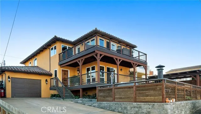 Spectacular property in Morro Bay Heights. This custom home was carefully built in 2005 with quality craftsmanship and details in mind. Enjoy stunning panoramic rock and ocean views from the downstairs family room. Open the double doors onto the grand lower deck and imagine entertaining family and friends. Pass by a large laundry room, full bathroom and 3 well sized bedrooms to the back deck, relax next to the mature Koi pond that helps create this peaceful setting. Beautiful and well-maintained Spanish tile flooring throughout. The upstairs open floor plan is filled with natural light from well-placed windows, creating stunning views from every room. Granite counter tops, Viking range, an oversized island and more views are just a few of the special features the cooking enthusiast will love in the gourmet kitchen. The living room boasts an impressive custom wood mantle setting above a g...