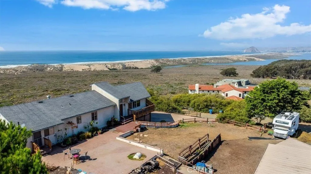 Perched above the coastline beside Montana de Oro State Park, this idyllic piece of paradise offers sweeping 270-degree views of the Pacific Ocean, Morro Rock, and the back bay, all framed by hundreds of acres of preserved natural land. Wildlife abounds here, from migrating whales and soaring birds to coyotes and more, creating a rare connection to nature in every direction. From its hillside perch, the home enjoys ever-changing views within an unchangeable vista—one of the Central Coast’s most treasured panoramas. Golden light washes the landscape by day, while celebrated daily sunsets paint the horizon with unforgettable color, ensuring that no two evenings are ever alike. The nearly two-acre coastal ranchette is an equestrian’s delight, featuring onsite horse facilities and direct access to endless outdoor adventures. Ride for miles along deserted sandy beaches and explore the extensive trails that wind through the park’s breathtaking coastal bluffs, dunes, and rolling hills—all just beyond your fenceline. The rustic yet spacious home is designed for versatility, ideal for sharing or multi-generational living with separate entrances to two private guest suites on the lower level. Inside, high vaulted ceilings and expansive picture windows bring the outdoors in, while custom details showcase unique craftsmanship—stone countertops with embedded quartz, hand-painted ceramic knobs, and cabinetry crafted by a master boat builder. Enjoy a glass-walled soaking tub with ocean views, a large dream workshop for creative projects, the convenience of owned solar, and the enhanced safety of two fire hydrants. Strong bones and timeless charm make this home easy to reimagine while offering endless possibilities. A rare blend of coastal beauty, small-town character, and outdoor adventure—Costa Azul Ranch is a once-in-a-lifetime find.