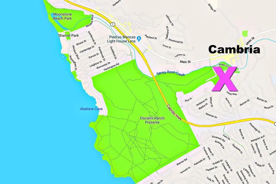 Driving Directions: From Hwy 1 in Cambria, turn north on Burton Dr. Turn left on Patterson Pl. Continue straight on Rogers Rd. Parcel is on the right, near the intersection of Pine St and Rogers Rd. Take the aerial map.