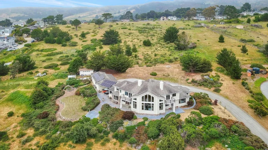 Reduced!! 2+ acre parcel overlooking expansive ocean and mountain views; truly an escape from the ordinary and yet so close to SF, SFO, Peninsula and Silicon Valley. Volume ceilings at 28' and an impressive curved, open staircase, a wall of picture windows looking out to the natural landscape; watch the whales from the living room! Open floor plan with most amenities on the first floor: spacious formal entrance, living room, dining room, library/office, media room, walk-in pantry and laundry room and gourmet kitchen with prep island and dining bar, dinette area. Two master suites (one upstairs and one downstairs), upstairs guest rooms with ocean views (one with kitchenette). Downstairs master retreat has gas-lit fireplace and spa bathroom with double vanity, deep jet tub and shower for two, walk-in closet and gorgeous ocean views.