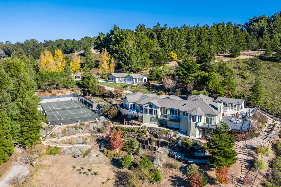 Idyllically set on a five-acre parcel with remarkable landscaped grounds and breathtaking ocean and mountain views, this rare one level Woodside compound offers privacy, serenity, and abundant relaxed living and entertaining spaces. The main house features a gorgeous chef's kitchen replete with granite countertops, marble tile backsplash, top of the line appliances and a breakfast nook. Elegant living and dining rooms showcase the stunning nature backdrop. The family room has an open vaulted ceiling, cozy fireplace and sliding doors that lead out onto a large-scale deck. The beautiful master suite boasts cathedral ceilings, a spacious walk-in closet, peaceful bathroom and private deck. The airy ambiance continues throughout the additional bedrooms and bathrooms. A mudroom/laundry room and attached three-car garage round out the main home. A second structure is currently in use as a study, with vaulted beamed ceilings and a gas fireplace. An outdoor kitchen and travertine paved dining space set the tone for outdoor entertaining. A third structure features dual two-car garages, set up as a workshop and gym. An additional half bathroom and extra kitchen make for convenient entertaining. The property also features a full size tennis court.