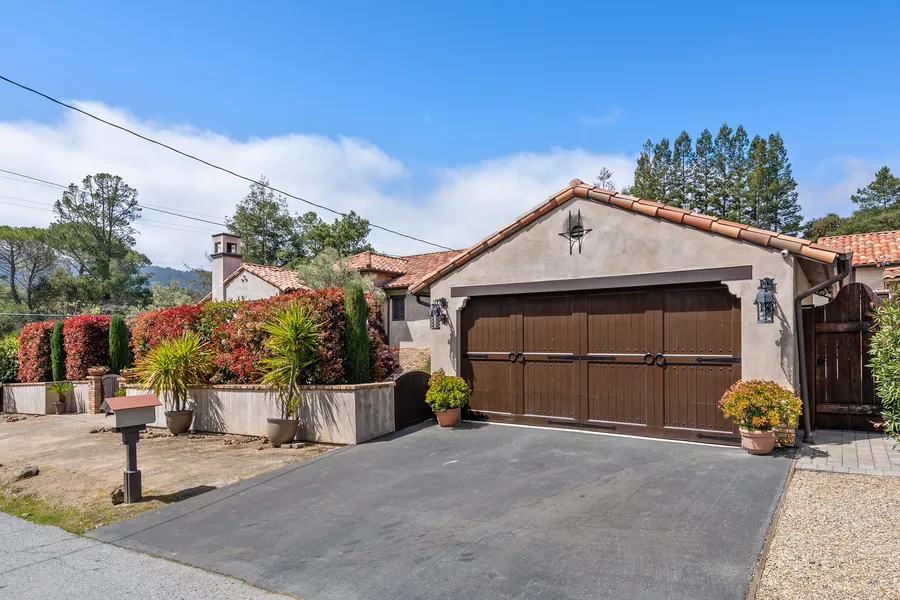Custom built in 2012, this Mediterranean style villa offers plentiful indoor and outdoor space as well as a separate guest house with a full kitchen and bath. This home welcomes you with an enclosed front yard and beautiful tile work at the entry and sits on one level. The expansive living room features vaulted ceilings, an elegant fireplace and plenty of windows and a sliding door that leads out to a deck that overlooks the lush lawn. The gourmet kitchen boasts high quality cabinets with an island and beautiful stone countertops, a gas range with a pot filler and Thermadore appliances and a separate beverage fridge. An adjacent family room opens to the kitchen and offers a fireplace as well as access out to the side yard that also has a second gate from the main road and additional parking. There's also an elegant powder room off the main entry.