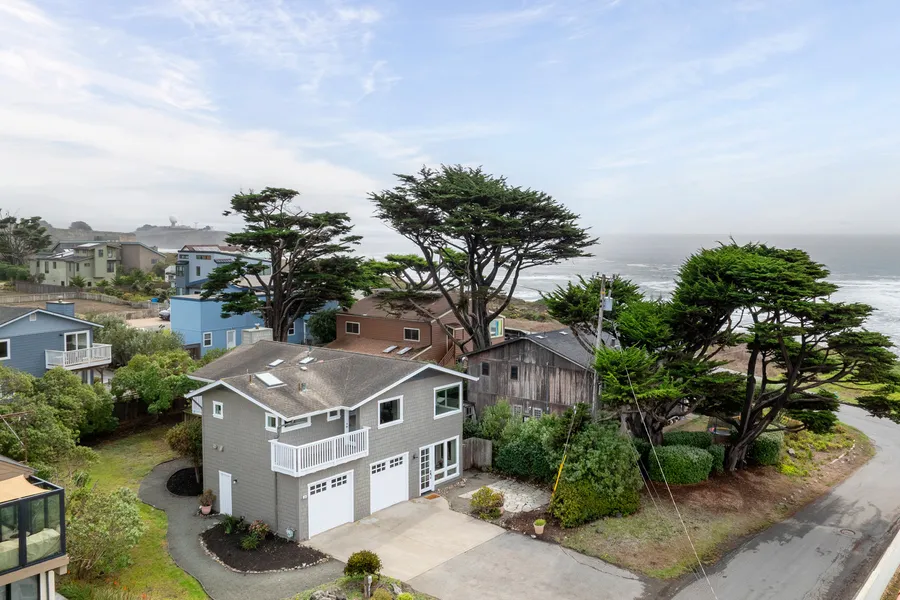 Living in this newly remodeled home steps to the Pacific Ocean is a dream come true. The unique characteristic about the way this home is designed is that it can be lived in as a single family home or two units. Both areas have separate full kitchens, baths, living areas and bedroom. The entry is styled as a chic mud room where one can access both of the garages. It leads to a book lined staircase which leads to the second story and the amazing ocean views. The living room has a large window facing the bluffs and the sea below. The dining area is spacious with room for lounging as well as enjoying a beautiful meal. The kitchen island connects this room to the light filled, extraordinary kitchen. A stunning red La Cornue stove is the focal point as well as the walls of windows and majestic views. The natural granite counter tops add a modern twist. Lots of storage and an adjacent deck with gas hookup makes this kitchen functional and the heart of the home. The primary bedroom has built in closets, views of the water and an adjoining office/ nursery area. The bath is large with a separate toilet room, a large shower with views and double sinks. There are hardwood floor throughout. There is an additional full bath with artistic tile for use by guests. On the entry level is a living area with doors to the exterior gardens. There is a bedroom with large closet as well as a full bath designed with a modern flair. The kitchen has a view of the lamdscaped side yard and also marble countertops, gas oven and stove, refrigerator and lots of storage. Walk to the distillery or to the harbor, this home is in an ideal location. Relax and watch the sunsets each evening from this home where every detail has been meticulously designed.