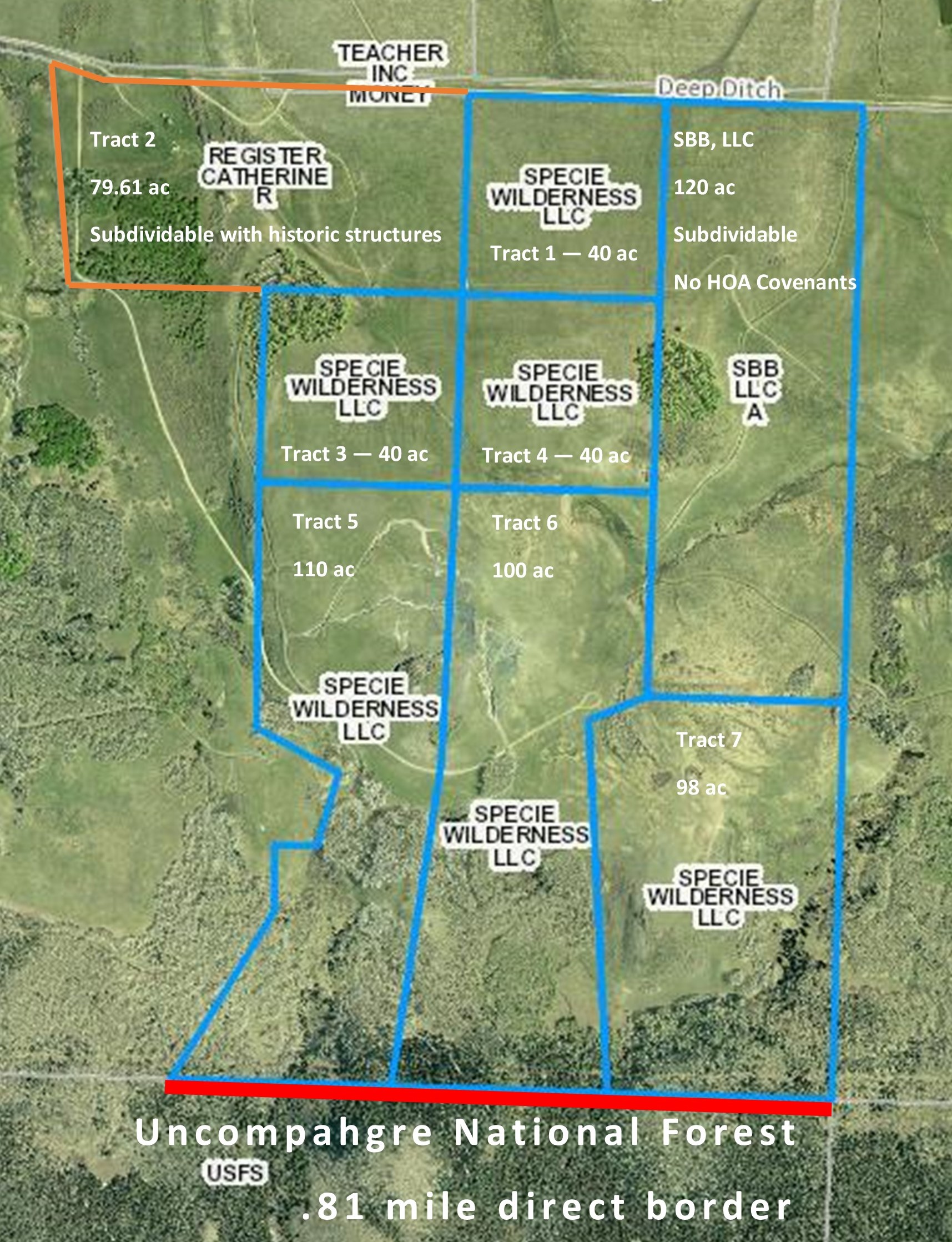 Entire Specie Wilderness Ranch Tracts 1/2/3/4/5/6/7 + SBB Adding on the 80 acre Tract 2 (the separately owned Register Ranch) to the above would allow the new owner complete and sole control of the entire Specie Wilderness Ranch. With as many as 11 potential home sites, this ~628 acre configuration could be highly desirable to a conservation easement minded buyer (none exist today). Asking $6,950,000 / MLS# 39476 & 39464