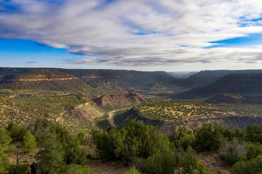 It is estimated that approximately 40% of the ranch is comprised of high elevated mesas. The remaining approximately 60% of the property is a combination of canyon walls, rugged ridgelines and lower canyon bottoms. Without question, the HOBO Ranch can accurately be described as having the most rugged topography to be found in the entire state. Views from the upper mesas into the deep canyon drainages are amazing. Two major canyon areas form the southern portion of the ranch. The most significant canyon area is Caon Largo (Large Canyon). The north rim of this deep canyon forms the south operational boundary of much of the ranch. Caon Ciruela (Plum Canyon) heads and drains through the central portion of the ranch, ultimately merging with Caon Largo, towards the eastern portion of the property. Three other canyons, Chispas Caon (Sparks Canyon), Spring Caon and Lucero Caon form and drain on the east half of the ranch, eventually joining Caon Largo. Spring Caon is appropriately named because of natural springs along the canyon walls. There are also seasonal springs and scattered pools of water along the bottom of all the canyons throughout the ranch.
