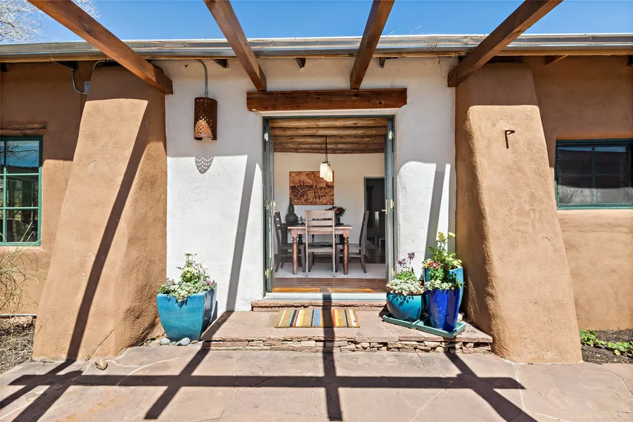 An easy 30-minute commute to downtown Santa Fe, these two adjoining properties comprise just under two acres in the rustic village of Rowe, offering 360-degree views of the picturesque Rowe Mesa and Sangre de Christo mountains. The tree-shaded landscaping is an idyllic setting for the flagstone patio, portales and a gardened courtyard enclosed by an adobe brick wall. The main house has two bedrooms, a full bathroom with soaker tub and a comfortable office space, all with updated electrical, plumbing and windows. The newly renovated kitchen features beautiful white quartz countertops, stainless steel appliances and a large inset sink, perfect for the home chef. Bright, light-filled rooms offer all the charm of the northern New Mexico style, including original vigas and wide-planked pine floors. The adjoining property, on a shared well with the main house, has a one bedroom/one bathroom ca...