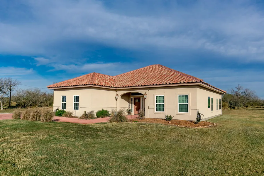 Private, Secluded 1 story stucco home built in 2014 on 40 acres of land just outside the city of Sinton. Perfect for deer, dove, quail, hog hunting on this property. This home is loaded with tons of upgrades and unique features throughout, some include: concrete tile roof, fenced in yard, screen in patio, open floor plan, kitchen opens to living & dining, stained concrete floors & carpet in the bedrooms, custom maple cabinets & framed mirrors & shelving throughout, granite counters with undermount sinks, smooth top range, upgraded vent hood, tile backsplash, recessed lighting, jet tub & walk in shower in master bath, his & her sinks, large walk in closet with builtins, 3-Car Attached Garage equipped with heat, air, electric, & cable easily convertible into living space...OWNERS WILL CONSIDER SELLING THE HOME WITH MORE ACREAGE AS WELL, AT AN INCREASED PRICE!!