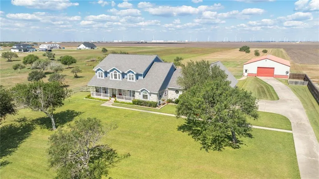 Situated on approx. 4.5 acres this custom one owner estate (barn/workshop 2400 sq. ft. & pool/hot tub) offers amazing water views of Nueces Bay & Corpus Christi skyline. This property has unique feature of 30 foot easement providing access to waterfront. Owner has option to build pier & boat dock/lift to enjoy fishing/boating activities. Home features include hardwood floors, high ceilings, crown molding, 50 yr roof, impact windows (2nd floor), 2 staircases, huge bonus room (or 5th bedroom). Great room boasts fireplace as focal point & opens to casual dining & large kitchen. Formal dining & office are off foyer with sweeping staircase. Guest bed/bath down & large upstairs primary suite with spa like bath. Spacious covered porch & open patio overlook gorgeous pool. Great space for entertaining! You'll love the lifestyle this estate has to offer...country living with all the conveniences o...
