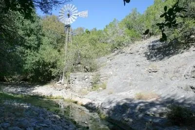 Two draws cross the ranch and carry substantial amounts of water during heavy rainfall. A small spring of fresh water gently flows into one of the draws providing drink for the wildlife and livestock. There is also a hand-dug water well with an old windmill that, when in good working condition, pumps water into a small rock-walled reservoir for storage. This was once an old pioneer home site along the banks of Flat Branch.
