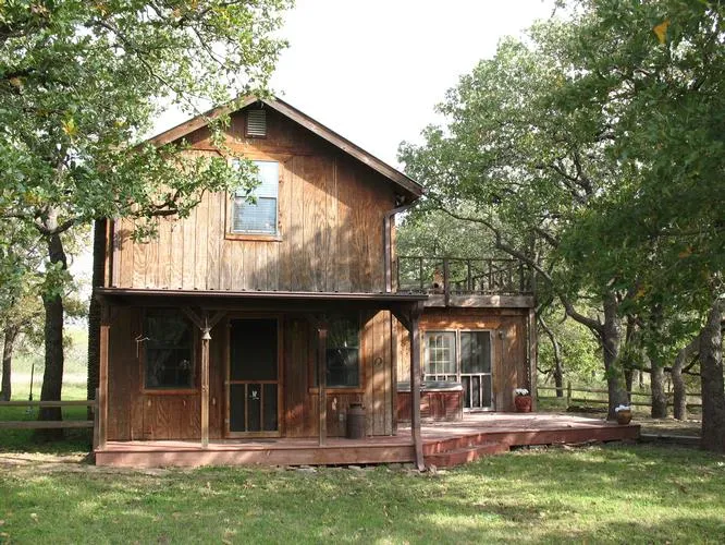 A charming cabin constructed of rough cedar siding built in the pioneer Texas Country style is shaded by large oak trees and enclosed by a rail fence. Porches, decks and a rock patio connect the separate bunk house to the main house and extend the living space to the...