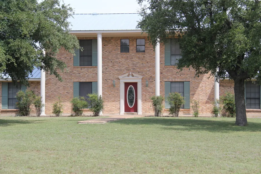 A wide expanse of lawn bordered by a white rail fence showcases this beautiful 2-story home built in the neoclassical style with tall columns, windows flanked by shutters and a solid symmetrical design. Large oak trees grace the landscape and offer pools of shade. The downstairs floor plan includes a great room with wood burning fireplace, a formal dining room, kitchen separated from the breakfast room by a dining bar, a laundry room and the master suite consisting of 2 rooms: the bedroom and a sitting room/office separated from the bedroom by double French doors, a huge walk-in closet and a bathroom. The stairs lead upward from the vaulted-ceiling of the foyer to 4 bedrooms or two 2-room suites, depending on how they are used and a shared full bath. The exterior of the home is brick and siding and the metal roof was recently replaced. The home is all electric with central heat and a/c. A new septic system was recently installed. A concrete patio separates the main house from the recreation/pool house and is the perfect place to host parties for teens and adults. The clear, blue swimming pool is hard to resist on hot summer days. Beyond the swimming pool is the tennis court. Beyond the groomed area around the home and amenities is native pasture with walking trails and a pond and nice views of the distant hills. The entire property is fenced