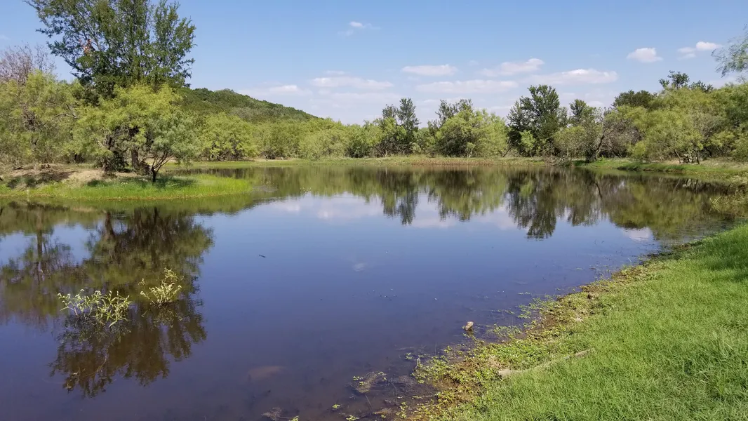 DESCRIPTION: A thick hedge of cedar growing along the fence line has kept the features of this place secret from those driving past on FM 580 for decades. Hidden from view is a 3 bedroom/2 bath 2000+ sf home with a stone exterior and a metal roof. The seller helped his father-in-law build the home in 1994 and can attest to the sturdiness of the construction. However, by now, renovations will be needed. A strong water well provides good water for house use. In addition to the home, there is a very tall and large (approx. 50' x100') metal building on a concrete slab with roll-up doors on either end plus a walk-thru door. A single wide mobile home under a metal awning is also located on the property that has not been lived in for many years and contributes no value to the property but could be used for storage. The land is heavily covered in mesquite trees with elms and maybe an occasional oak tree growing along the water courses. A very pretty pond/tank provides surface water for wildlife and livestock and fishing opportunities for people. Behind the pond, the land rises sharply upward to the top of a tree covered hill with amazing views of the surrounding area. Not a surprise that this habitat is favored by white tail deer, wild turkeys, dove and other wild life. This is your chance to own a nice place in the best part of San Saba County. Come check out the secrets!