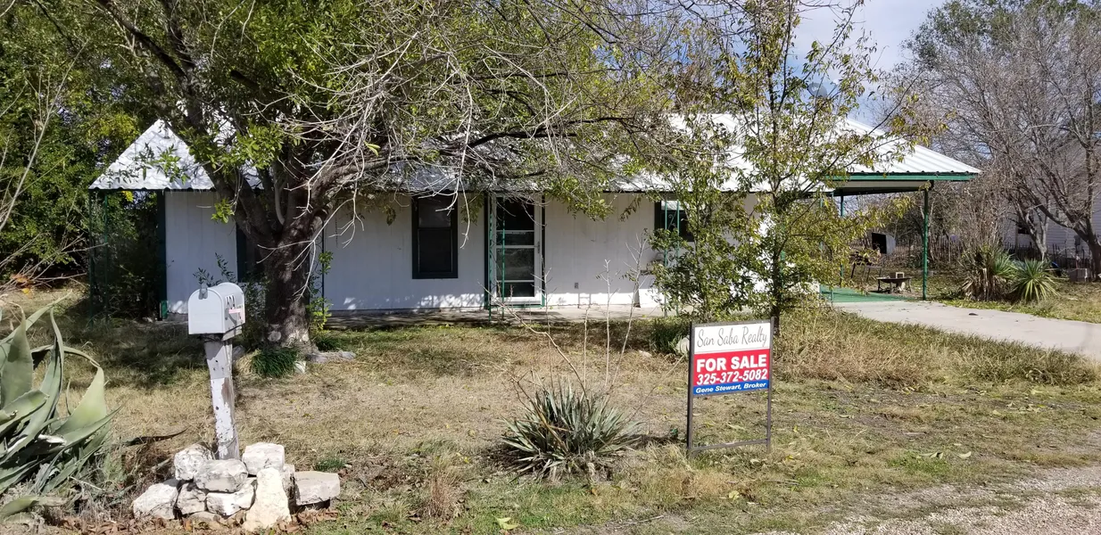 Energy efficient all-electric home is conveniently located just a couple miles north of town. The floor plan includes 3 bedrooms, 2 baths, and a bonus room that could be used as a formal dining room. Two separate central air units heat and cool the houseone is a heat pump and the other is a standard electric central heating and cooling system. Good insulation, double pane windows, metal roof and ceiling fans add to the energy efficiency. The home has about 1600 sq.ft. of living area (according to CAD), a covered porch across the front, attached single-car carport and a large utility/laundry room. The spacious back yard is big enough for a garden and still has room for kids to play. It is bordered on 2 sides by open pastureland. Water is supplied by North San Saba Water District.