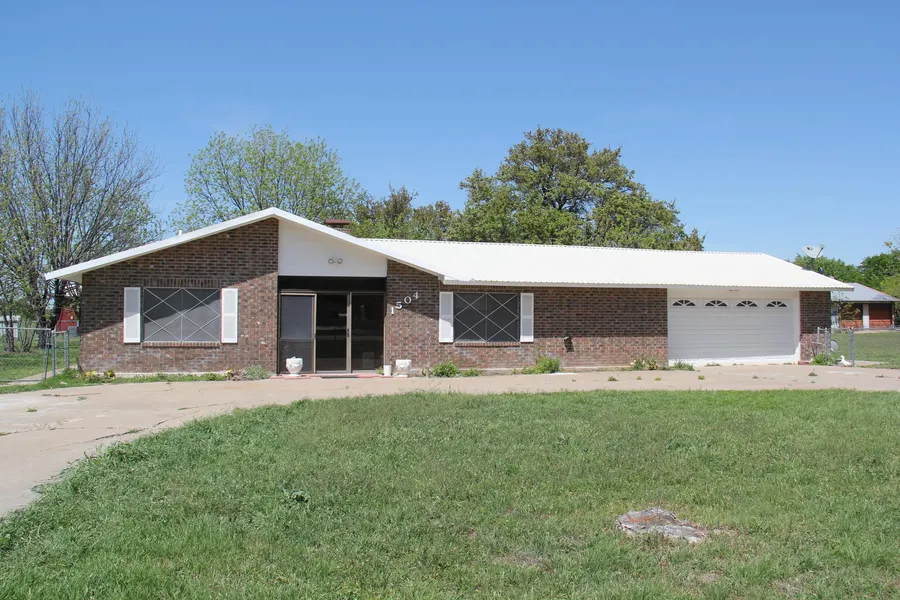 This traditional ranch style home is clean, freshly painted and move-in ready. The floor plan offers plenty of living space and flexibility for an active family. The exterior is brick with a metal roof. A large living room is situated left of the foyer. To the right of the foyer is a formal dining room with wonderful built-in wall of covered shelves--perfect for storing seldom used kitchen equipment, china, linens, etc. This room would also make a great home office. The kitchen, complete with stove and refrigerator, is wrapped in warm natural wood cabinets, has tile counter-tops providing generous space for food preparation, a separate pantry and a dining bar. The adjoining space is made cozy with a wood-burning fireplace and can be used as either a dining room or second living area. Two family bedrooms with ample closet space share a hall bath. The third bedroom has an attached dressing area and bathroom. Living space is further expanded by a sunporch and a covered patio area. Access the spacious double garage (with automatic roll-up doors) and storage area either from the kitchen through the mud-room/laundry room or via the sunroom. The oversized HVAC system and ceiling fans keep the house comfortable. The home is situated on a completely fenced lot approximately an acre in size and shaded by more than a dozen large pecan, oak and fruit trees. Two storage buildings and a covered carport are located at the rear of the property. The real bonus is the approx. 960 sf three-room shop building with bath that could be easily converted into a mother-in-law cottage or an apartment. This building is situated apart from the main house at the NE corner of the property and has frontage on Anita Street. The main house is located at the SW corner of the property facing Sunset Street, leaving the SE corner vacant and a perfect location of another small home. Dont overlook the potential for extra income by making this a VRBO property! The location at the end of a dead-end street shared with only 2 other homes minimizes street traffic. Make an appointment to see this one today!