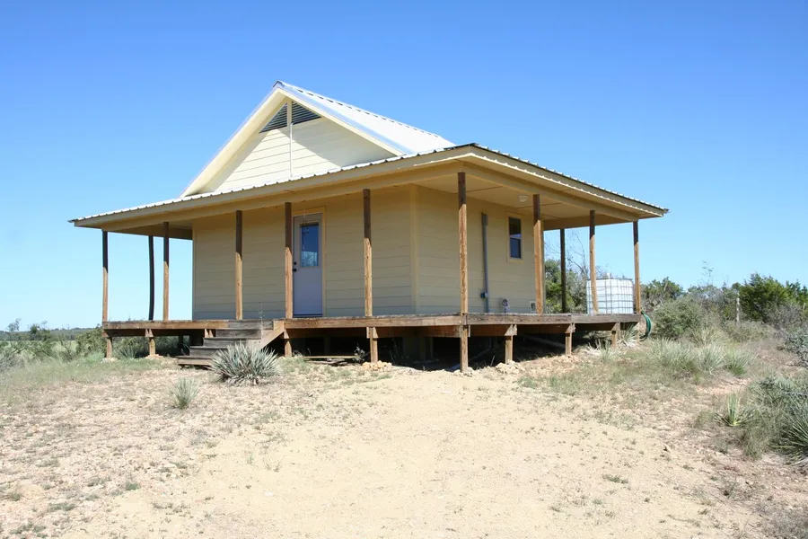The cabin is simple and efficient. It is about 24 ft. by 18 ft. (outside dimensions) plus a 4 ft. wide covered wrap-around porch. It has one large room and a bathroom, a metal roof and concrete board siding. The cabin is about 90% complete. The interior ceiling and walls are already covered with sheetrock and only need to be tape, textured and painted or covered with your choice of wallboard. The floors are the plywood subflooring and you may want to install floor covering. The cabin has electrical service. There is no water well or public water source. The current owners purchase water from the city of San Saba and haul it to the property where it is stored in a storage tank and pumped into the cabin. They use bottled water for drinking and cooking. A list of furniture and other items that will stay with the cabin and property will be provided upon request.