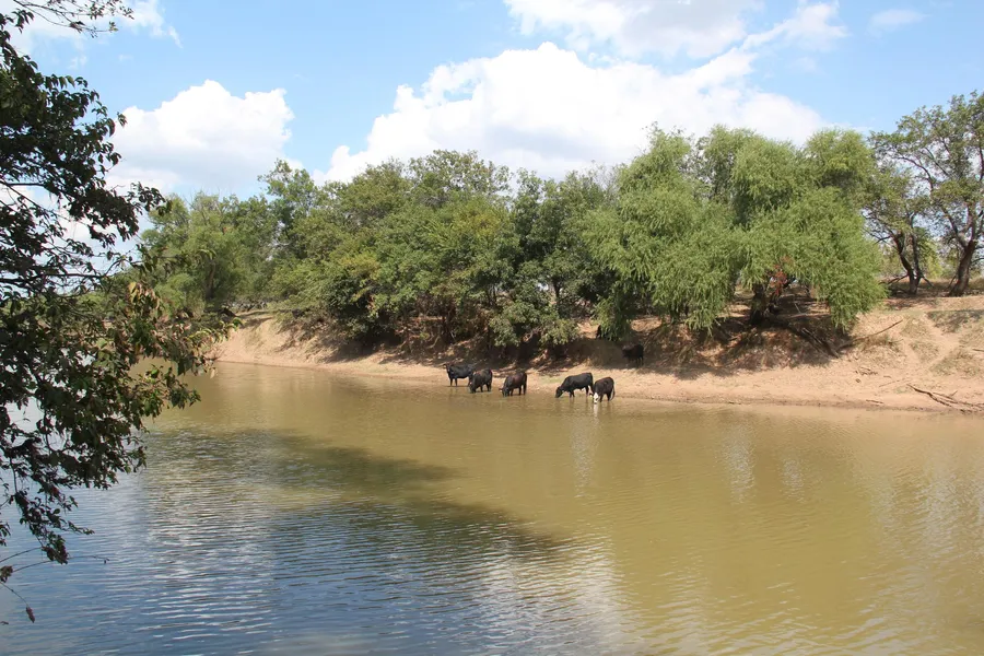 Large oak and pecan trees scattered on acreage, dense tree cover along river