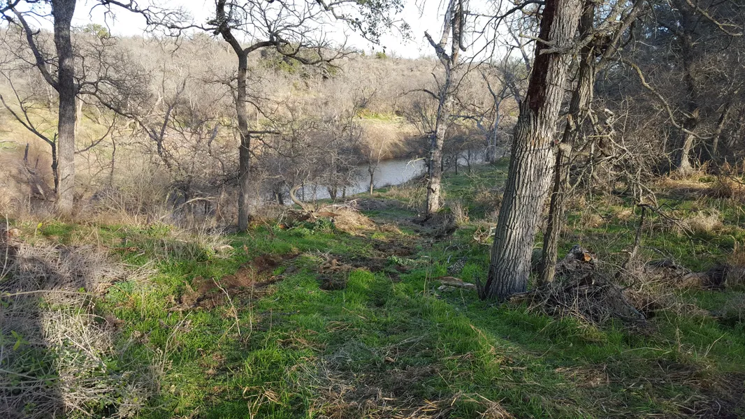 The property is beautiful with about 80% native grasses dotted with clusters of large oak trees and a few mesquites and about 20% heavily wooded, mostly along the river. Natural terraces create a gentle slope down to the river. The elevation offers some long views and the dark night sky displays the beauty of the heavens. The quietness of the country allows the sounds of nature to come through loud and clear. The property is fully fenced on all sides with one cross fence.