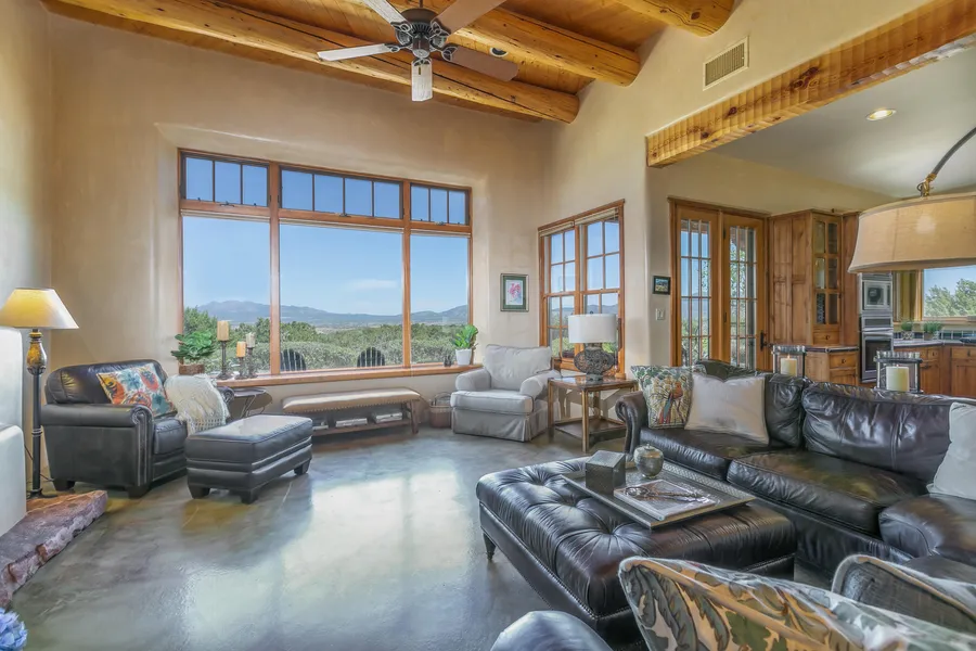 Santa Fe Style Charmer: Sweeping Mountain Views!Have you ever wanted to live in an upscale, yet rural community, just 30 minutes from a major city? This Santa Fe adobe style three bedroom home has 360 degrees of views, views, views! Relax in the quiet, premier neighborhood of San Pedro Creek where you can enjoy over 600 acres of the beautiful and private nature preserve, private trails, and Open Space. This home, designed by Jim Beverly, offers beautiful Santa Fe custom design at every turn. If southwest is your style, you will enjoy everything from the massive Santa Fe front door to the raised T&G beamed ceilings, Gaye Goodman hand-painted concrete floors, Earnest Thompson custom cabinetry, extraordinary use of Talavera tile in the kitchen and bathrooms, and diamond plaster, including