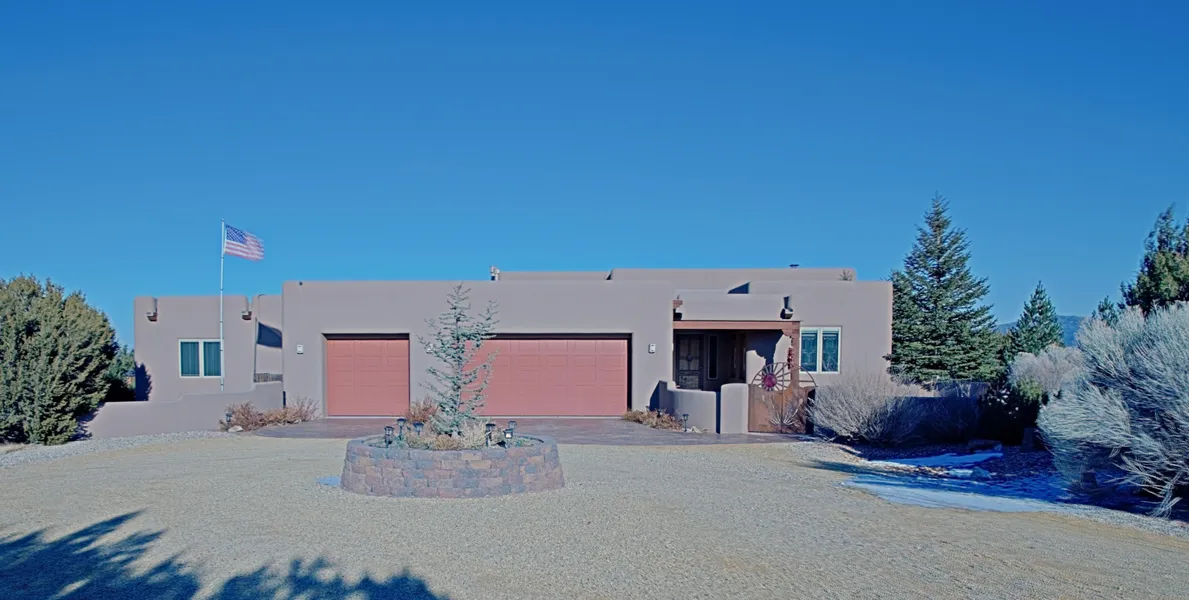 A Show Stopper! The homes is on 10 acres surrounded by five majestic mountain ranges where you can ski. golf at Paako, hike, bike and ride horses to your heart's content? Located in San Pedro Creek Estates,in between ABQ and Santa Fe. With over 3100 sq ft to enjoy and two walled courtyards beautifully. Over 3100 SF built by Richard Crombie. Front and back landscape within closed courtyards. Third bedroom used as a combo office-guest room with fold down murphy bed.